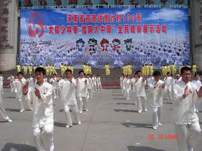 "焦作公司訊 4月29日上午,焦作中燃公司40余名員工踴躍參與了在焦作市東方紅廣場舉行的、以河南省迎奧運倒計時100天“太極少林拳•擂響大中原”為主題的全民健康展示活動。