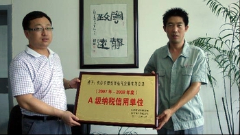 焦作公司訊 6月19日上午,焦作中燃工作人員從該市國稅局領導手中接過了象征誠信納稅最高級別榮譽的“A級納稅信譽單位”匾額。據悉,該獎牌系由國稅、地稅聯合監制而成,焦作中燃是省內第一家獲此殊榮的企業。與此同時,焦作公司還獲得了焦作市政府授予的“誠信納稅企業”稱號。