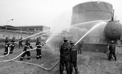 在指揮部的統(tǒng)一指揮下,警戒組、技術組、滅火組、鋼瓶轉移組高速運轉起來,水帶連接、滅火器到位……一切都在緊張有序地進行著,兩條銀色的“水蛇”也急不可待地向罐體的泄漏處飛射而去。