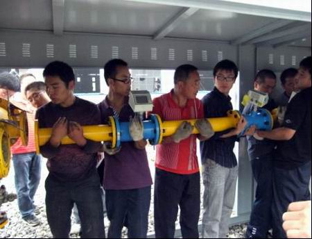 先是將以前的調壓柜拆掉,雖然安裝調壓柜的地方都是軟泥,但是大家已經顧不得臟了,你扛我抬,僅用了十幾分鐘的時間就完成了全部拆卸。然后是搬運到新地點重新安裝,按照圖紙的設計,大家在黃耀武經理的指揮下,對調壓柜內部的零件進行了重新拼裝。擰螺絲的擰螺絲,遞工具的遞工具,每個人都在認真地干著自己的工作。雖然頭上淋著小雨,鞋底沾滿泥濘,但是大家的工作熱情卻依舊高漲,為了用戶的用氣安全,擰緊每一個螺栓,放正每一個墊片……大家的臉上滿是水珠,已經分不清是雨水還是汗水,為了盡快完成改裝,不耽誤用戶的生產用氣,工作一直持續到將近下午一點鐘,雖然大家都是又熱又累,但是看著自己的勞動成果,大家都發自內心地笑了。