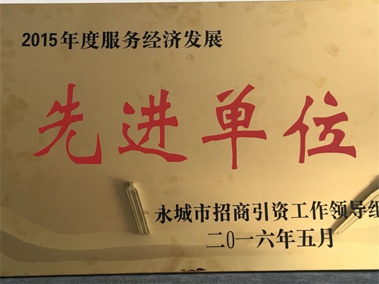 永城公司訊 近日,永城公司首次被永城市招商引資工作領導組授予“2015年度服務經濟發展先進單位”榮譽。